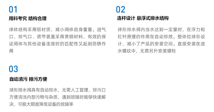 鋁制浮球桿桿式球形排水閥,可自動排水無需人工管理和其他功能,整體位球體設計減小了產品的安裝空間,閥體可以直接安裝在進水螺紋上,無需另外安裝螺栓。